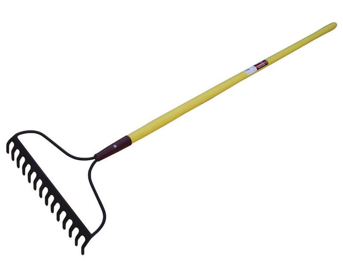 14 Tines bow rake fiberglass handle. Great for spreading earth, clearing flower gardens, and loosening soil, also useful for raking branches.