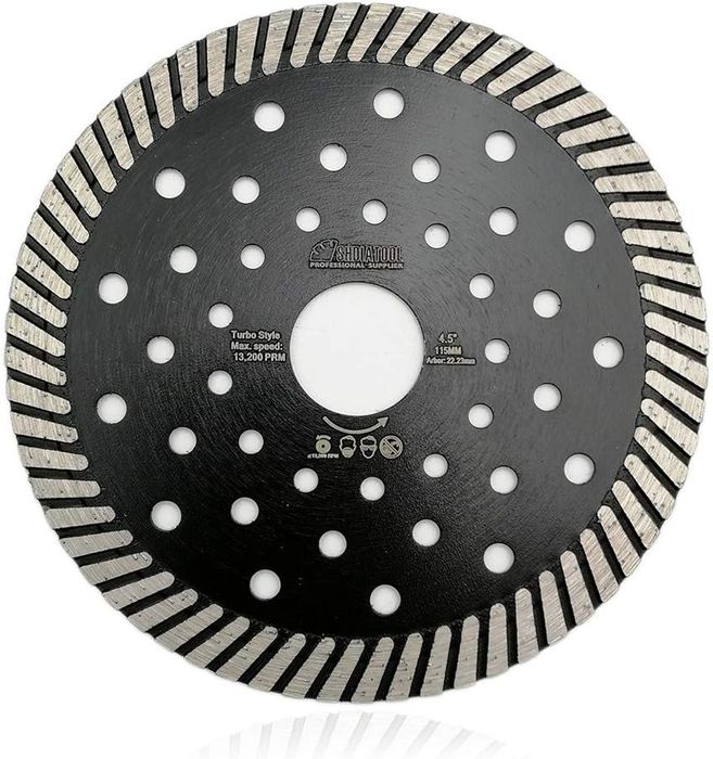 - For tile, granite, marble and concrete - 1 pc 4-1/2 INCH Diamond Turbo Cutting Blades with Multi Holes - Diameter 115mm/4.5" Segment height 10mm Segments thickness 2.0-2.1mm Bore 22.23mm (7/8") - Machinery: Angle Grinder, circular saw, Masonry Saw, table Saw - Dry or Wet Cutting Chip-free
